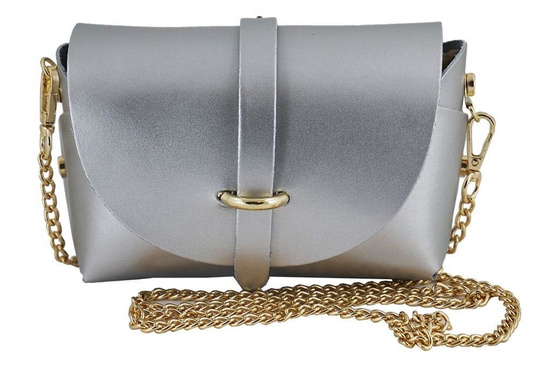 Wnętrze torebki: jednokomorowe torebki ze skóry metalizowanej są surowo wykończone. Zapinane są paseczkiem przechodzącym przez złotą ozdobną szlufkę. Długość łańcuszka: 120cm.