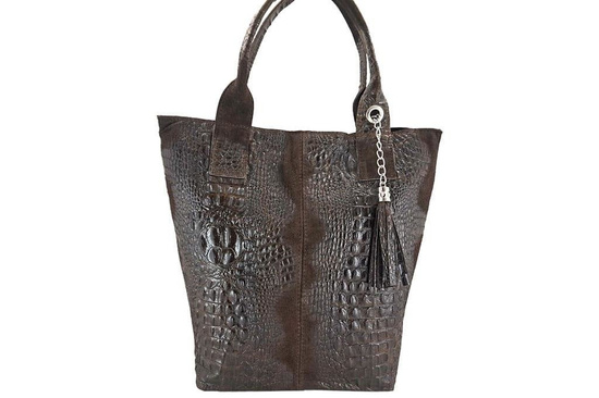 Modny worek skórzany - CROCO został wyprodukowany we Włoszech, wykonany ze skóry naturalnej zamszowej. Propozycja sklepu internetowego - torebka, która uzupełni swobodne stylizacje. Miękka zamszowa skóra naturalna, wygodnej długości uchwyty, modny frędzelek i zwierzęcy motyw - wszystko to gwarantuje, iż Twoja stylizacja będzie wyjątkowa. Modny worek skórzany typu shopper, mieszczący format A4, na wygodnej długości uchwytach idealnie komponuje się ze swobodnymi casualowymi stylizacjami do pracy oraz na uczelnię. Skorzystaj z naszej oferty i odbierz rabat -15% za zapisanie się do newslettera.
