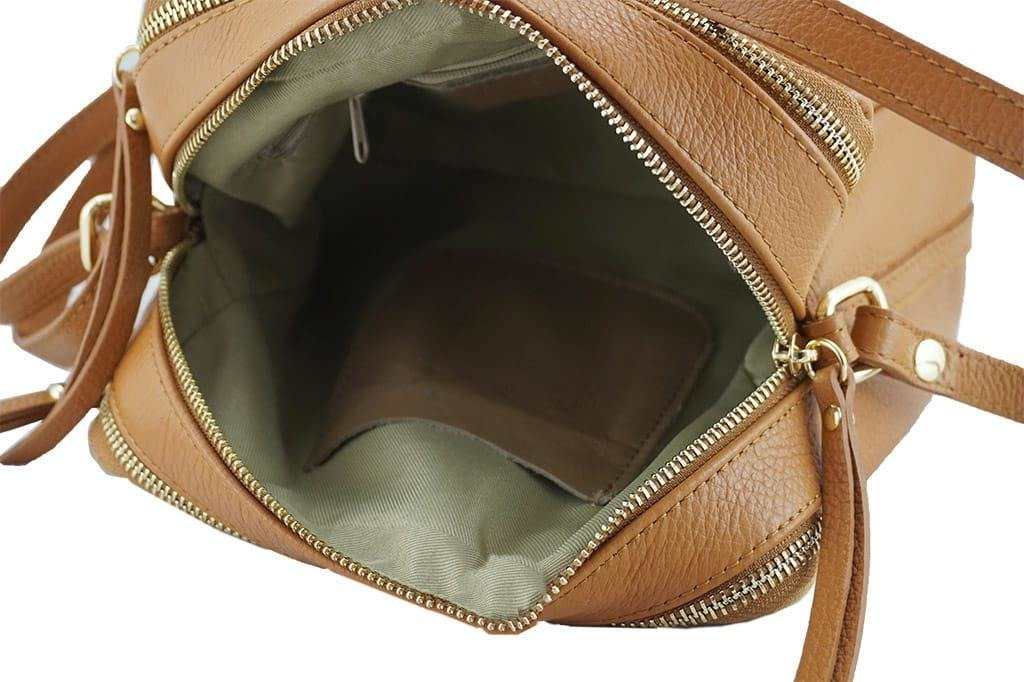 Wnętrze torebki: trzy odrębne komory wykończone są podszewką, zamykane na suwak zakończony skórzanym paseczkiem. W środkowej części, największej, znajduje się zasuwana kieszonka oraz miejsce na telefon. Torebki listonoszki skórzane posiadają regulowany pasek (maksymalna dł. 137cm, maksymalna wys. 63cm).