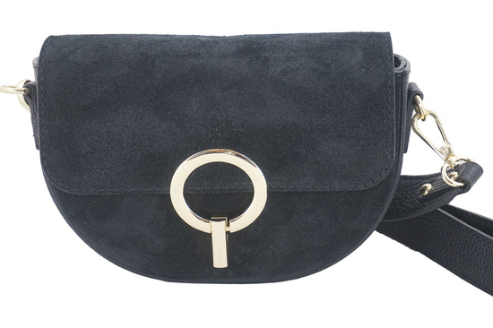 Wnętrze listonoszki: jednokomorowe wnętrze jest wykończone podszewką. Wewnątrz wyodrębniono zasuwaną kieszeń mieszczącą kosmetyki, klucze lub mały notes. Modna torebka wizytowa skórzana jest zapinana ozdobnym zapięciem, posiada złote okucia, wygony szeroki pasek bez regulacji (długość 105cm, wysokość 50cm, szerokość paska 3cm). Na zewnątrz, z tyłu, znajduje się zasuwana ozdobnie doszyta kieszeń. Łączenie skóry naturalnej licowej ze skórą naturalną zamszową wyróżnia ten model listonoszki dostępnej w kolekcji torebek skórzanych dostępnych w sklepie.