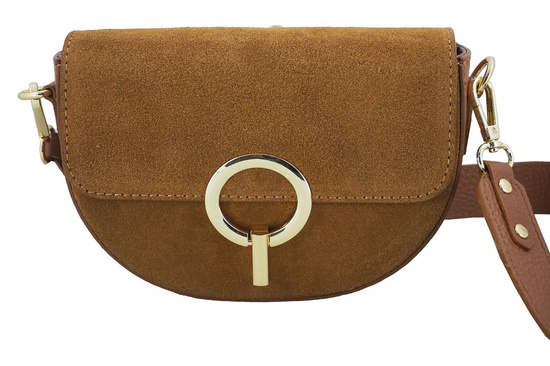 Wnętrze listonoszki: jednokomorowe wnętrze jest wykończone podszewką. Wewnątrz wyodrębniono zasuwaną kieszeń mieszczącą kosmetyki, klucze lub mały notes. Modna torebka wizytowa skórzana jest zapinana ozdobnym zapięciem, posiada złote okucia, wygony szeroki pasek bez regulacji (długość 105cm, wysokość 50cm, szerokość paska 3cm). Na zewnątrz, z tyłu, znajduje się zasuwana ozdobnie doszyta kieszeń. Łączenie skóry naturalnej licowej ze skórą naturalną zamszową wyróżnia ten model listonoszki dostępnej w kolekcji torebek skórzanych dostępnych w sklepie.