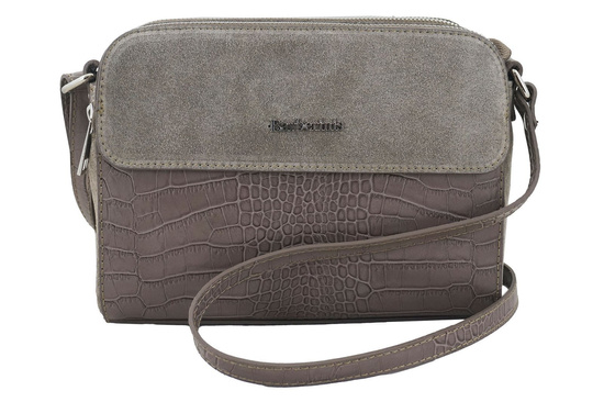 Wnętrze torebki: trzy odrębne komory są zasuwane i wykończone podszewką. W jednej znajduje się mała zasuwana kieszonka, w drugiej kieszeń otwarta mieszcząca telefon, niewielki portfel lub mały notes. Stylowa torebka crossbody trzykomorowa posiada srebrne okucia oraz długi regulowany pasek (maksymalna dł. 136cm, maksymalna wys. 65cm). Klasyczny fason zdobi zamszowa klapka oraz motyw zwierzęcy croco z przodu torebki.
