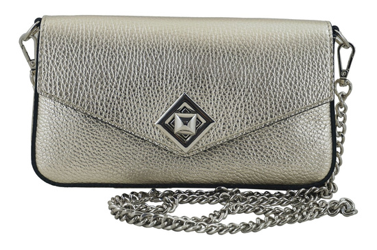 Wnętrze torebki: jednokomorowe wnętrze jest wykończone podszewką. Wewnątrz wyodrębniono małą otwartą kieszeń mieszczącą karty płatnicze, banknoty lub mniejsze kosmetyki. Modne torebki wizytowe metalizowane posiadają srebrne okucia, dopinany łańcuszek bez regulacji (długość 120cm, wysokość 60cm), są zapinane ozdobnym zapięciem wyróżniającym ten model listonoszki. Torebka wykonana ze skóry naturalnej metalizowanej uzupełni outfit nowoczesnej stylizacji kobiet podążających za najnowszymi trendami.