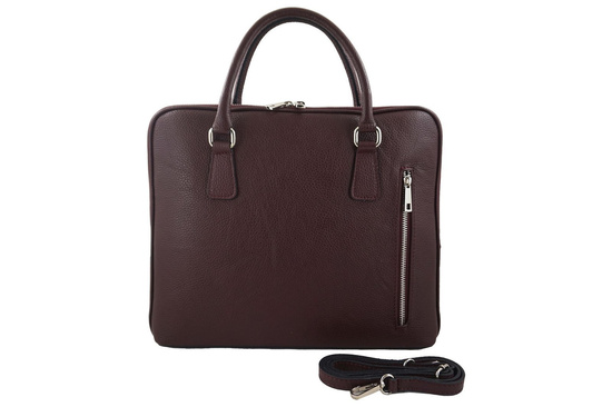 Wnętrze torby: jednokomorowe wnętrze jest wykończone podszewką. Wewnątrz znajduje się mała zasuwana kieszonka mieszcząca kosmetyki lub portfel oraz szeroka kieszeń zapinana na rzep mieszcząca dokumenty, notes / kalendarz oraz notatki. Skórzana torba na laptopa casual posiada ograniczniki z tkaniny zapobiegające wypadaniu rzeczy znajdujących się w środku. Jest zasuwana na całej długości (od podstawy do podstawy torby), posiada srebrne okucia, dwa wygodne uchwyty bez regulacji (dł. 40cm, wys. 13cm) oraz dodatkowy pasek na ramię z regulacją (maksymalna dł. 130cm, maksymalna wys. 65cm). Na zewnątrz znajduje się pionowa zasuwana kieszeń, wyróżniająca ten model, umożliwiająca szybki dostęp do kluczy lub telefonu.