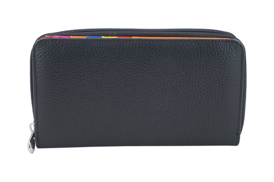 Wnętrze portfela: wielokolorowe wnętrze portfela, zapinane na zatrzask, posiada dziewięć miejsc na karty płatnicze, miejsce na dokument ze zdjęciem, cztery kieszenie na paragony, listę zakupów lub bilety oraz dużą przegrodę na banknoty. W części zasuwanej znajdują się dwie przegrody na banknoty, środkowa kieszeń zasuwana miesząca bilon oraz sześć miejsc na karty lub wizytówki. Antykradzieżowy portfel z ochroną RFID dostępny w najnowszej kolekcji Dla Pań będzie idealny rozmiarowo w torebkach klasycznych, plecakach, workach lub większych listonoszkach.