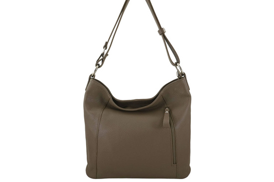 Wnętrze worka: jednokomorowe wnętrze jest wykończone podszewką i podzielone na pół dużą zasuwaną kieszenią mieszczącą kosmetyki oraz małą butelkę wody. Dodatkowo wyodrębniono małą zasuwaną kieszonkę mieszczącą np. portfel oraz miejsce na telefon. Pojemny skórzany worek na ramię jest zasuwany, posiada srebrne okucia oraz metalowe stopki na usztywnionym spodzie. Dwie zasuwane kieszenie na zewnątrz umożliwią szybki dostęp do kluczy oraz biletu komunikacji miejskiej. Boczna pionowa kieszeń z przodu ozdobiona jest skórzanym paseczkiem. Dużym atrybutem tego modelu jest możliwość noszenia torebki na podwójnym lub pojedynczym pasku - na ramieniu lub wygodnie przewieszonej przez ramię. Długość oraz wysokość pojedynczego paska: 90cm / 46cm; długość oraz wysokość paska podwójnego: 52cm / 23cm. Pasek mocowany jest na dwóch metalowych srebrnych kołach.
