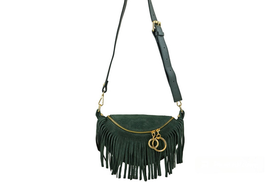 Saszetka nerka damska zamszowa w kolorze zielonym ciemnym, z modnymi frędzlami boho style została wykonana ze skóry naturalnej miękkiej. W najnowszej ofercie niewielkich i modnych torebek skórzanych szczególne miejsce zajmują saszetki nerki - praktyczne, wygodne i niezwykle stylowe. To idealna propozycja dla kobiet ceniących połączenie funkcjonalności z elegancją. Dzięki uniwersalnej formie saszetka nerka damska zamszowa będzie idealna do noszenia w różnych okolicznościach - zarówno na co dzień, jak i na specjalne okazje. To niezbędny dodatek galanterii skórzanej w szafie kobiet śledzących najnowsze trendy oraz dbających o każdy szczegół stylizacji na spotkanie, spacer, zakupy lub krótki wyjazd. Oferujemy wyjątkowe i gustowne torebki skórzane - listonoszki, plecaki, klasyczne oraz worki wyróżniające się modnym fasonem, subtelnymi ozdobami oraz solidnym wykonaniem.
