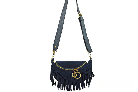 Saszetka nerka damska zamszowa w kolorze granatowym, z modnymi frędzlami boho style została wykonana ze skóry naturalnej miękkiej. W najnowszej ofercie niewielkich i modnych torebek skórzanych szczególne miejsce zajmują saszetki nerki - praktyczne, wygodne i niezwykle stylowe. To idealna propozycja dla kobiet ceniących połączenie funkcjonalności z elegancją. Dzięki uniwersalnej formie saszetka nerka damska zamszowa będzie idealna do noszenia w różnych okolicznościach - zarówno na co dzień, jak i na specjalne okazje. To niezbędny dodatek galanterii skórzanej w szafie kobiet śledzących najnowsze trendy oraz dbających o każdy szczegół stylizacji na spotkanie, spacer, zakupy lub krótki wyjazd. Oferujemy wyjątkowe i gustowne torebki skórzane - listonoszki, plecaki, klasyczne oraz worki wyróżniające się modnym fasonem, subtelnymi ozdobami oraz solidnym wykonaniem.