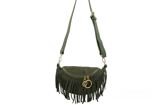 Saszetka nerka damska zamszowa w kolorze zielonym, z modnymi frędzlami boho style została wykonana ze skóry naturalnej miękkiej. W najnowszej ofercie niewielkich i modnych torebek skórzanych szczególne miejsce zajmują saszetki nerki - praktyczne, wygodne i niezwykle stylowe. To idealna propozycja dla kobiet ceniących połączenie funkcjonalności z elegancją. Dzięki uniwersalnej formie saszetka nerka damska zamszowa będzie idealna do noszenia w różnych okolicznościach - zarówno na co dzień, jak i na specjalne okazje. To niezbędny dodatek galanterii skórzanej w szafie kobiet śledzących najnowsze trendy oraz dbających o każdy szczegół stylizacji na spotkanie, spacer, zakupy lub krótki wyjazd. Oferujemy wyjątkowe i gustowne torebki skórzane - listonoszki, plecaki, klasyczne oraz worki wyróżniające się modnym fasonem, subtelnymi ozdobami oraz solidnym wykonaniem.