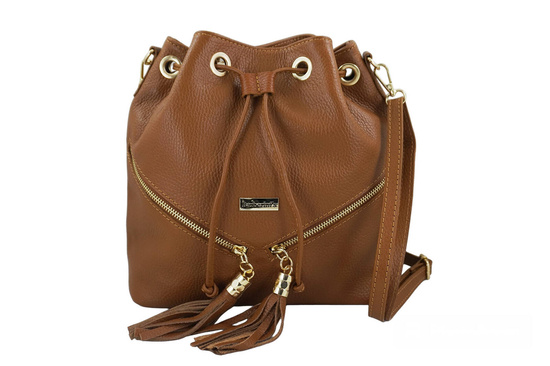 Torebka damska - worek z frędzlami w kolorze jasnego brązu została wykonana ze skóry licowej. Wygodne i pojemne worki skórzane to doskonała propozycja dla kobiet ceniących modny design oraz funkcjonalność. W naszym sklepie znajdziesz szeroki wybór torebek ze skóry naturalnej, które łączą w sobie elegancję oraz wygodę użytkowania, idealnie sprawdzą się na co dzień - mieszczą to co niezbędne do pracy, na zakupy lub krótki weekendowy wyjazd. Torebka damska - worek z frędzlami wyróżnia się ukośnymi złotymi suwakami oraz zapięciem typu "troczek", co nada Twojej stylizacji niezwykłej lekkości i ciekawego charakteru.