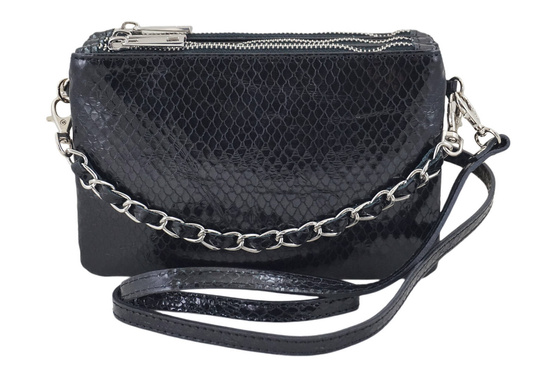 Wnętrze torebki: trzy odrębne kieszenie, wykończone podszewką są zasuwane. Skórzana lakierowana torebka wieczorowa posiada srebrne okucia, dopinany łańcuszek z ozdobnie wplecionym skórzanym paseczkiem (długość 30cm, wysokość 10cm) oraz długi dopinany regulowany pasek (maksymalna dł. 133cm, maksymalna wys. 64cm, szerokość paska 1cm). Niewielką torebkę, która mieści niezbędne rzeczy - kosmetyki, telefon oraz mały portfel, docenią kobiety, dla których liczy się styl, jakość i funkcjonalność. Sprawdź również wersję zamszową, licową lub metalizowaną z tego modelu dostępnego w szerokiej gamie kolorystycznej.