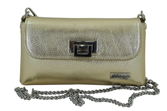 Wnętrze kopertówki: złota kopertówka z metalicznym połyskiem jest jednokomorowa, surowo wykończona. Posiada srebrne okucia, małą zewnętrzną kieszonkę bez zapięcia, mieszczącą np. karty płatnicze, oraz dopinany łańcuszek (dł. 125cm, wys. 63cm). Stylowy srebrny łańcuszek pozwala wygodnie nosić torebkę na ramieniu lub crossbody, a geometryczne zapięcie dodaje jej charakteru i podkreśla współczesny styl. Modna złota kopertówka z metalicznym połyskiem to idealny wybór dla kobiet, które lubią błyszczeć – z klasą. Praktyczne metalowe zapięcie chroni zawartość torebki, a starannie wykończone wnętrze pozwala wygodnie przechowywać najpotrzebniejsze rzeczy – telefon, pomadkę czy klucze.