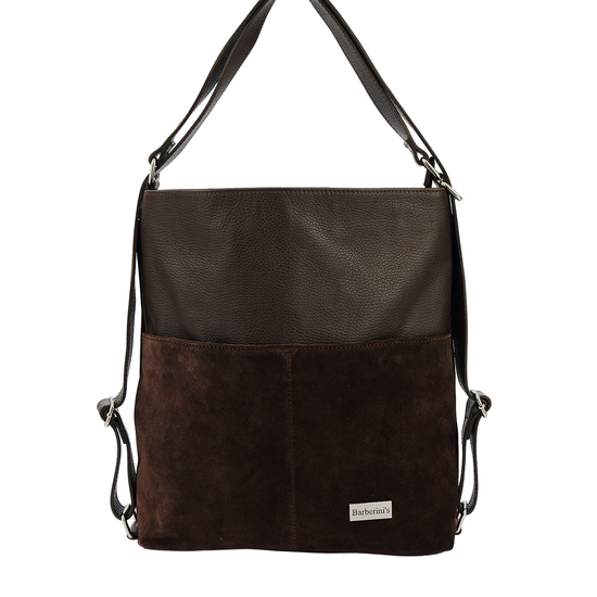 Torebka plecak z zamszem w kolorze ciemnego brązu - duża skórzana torebka 2w1 z zamszowymi kieszeniami marki Barberini’s. Elegancka i funkcjonalna torebka plecak z zamszem to idealny wybór dla kobiet ceniących styl i wygodę. Wykonana z wysokiej jakości skóry licowej w połączeniu z miękkim zamszem, zachwyca nie tylko wyglądem, ale i praktycznym wykończeniem. Torebka posiada funkcję 2w1 – dzięki regulowanym paskom można ją nosić na ramieniu lub jako plecak, dopasowując sposób noszenia do własnych potrzeb i okazji.