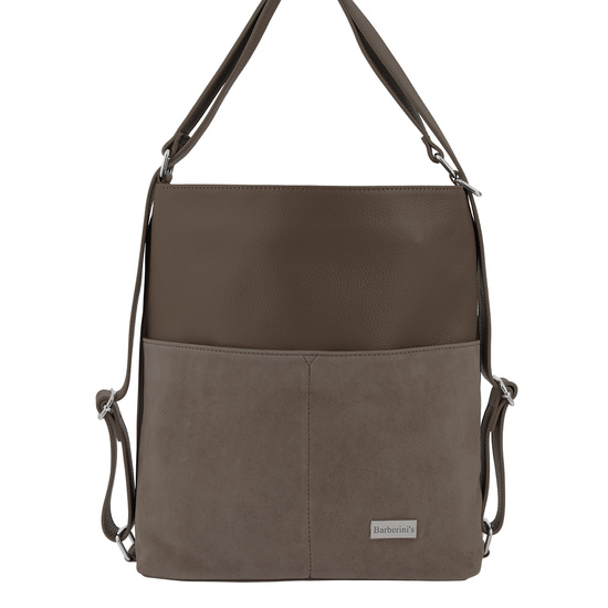 Torebka plecak z zamszem w kolorze ciemnego beżu - duża skórzana torebka 2w1 z zamszowymi kieszeniami marki Barberini’s. Elegancka i funkcjonalna torebka plecak z zamszem to idealny wybór dla kobiet ceniących styl i wygodę. Wykonana z wysokiej jakości skóry licowej w połączeniu z miękkim zamszem, zachwyca nie tylko wyglądem, ale i praktycznym wykończeniem. Torebka posiada funkcję 2w1 – dzięki regulowanym paskom można ją nosić na ramieniu lub jako plecak, dopasowując sposób noszenia do własnych potrzeb i okazji.