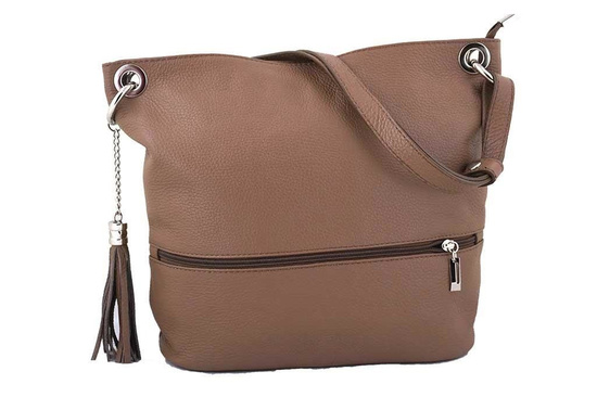 Wnętrze torebki: skórzane torebki włoskie wykończone są podszewką. Wewnątrz znajdują się dwie kieszenie - jedna zasuwana mieszcząca drobne kosmetyki oraz kieszeń na telefon. Na zewnątrz znajdują się dwie zasuwane kieszenie. Torebka posiada srebrne okucia oraz regulowany pasek. Może być noszona na pojedynczym lub podwójnym pasku, w zależności od sposobu zapięcia. Skórzane torebki włoskie wyróżnia ozdobny skórzany frędzelek na srebrnym łańcuszku.